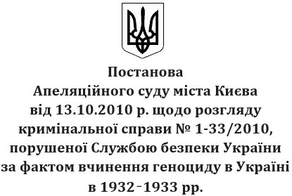 Суддя судової палати у кримінальних справах Апеляційного суду міста Києва Скавронік В.М., при секретареві Бондаренко М.С., за участю прокурора відділу прокуратури міста Києва Доценко О. М. здійснив попередній розгляд кримінальної справи №1-33/2010, порушеної Службою безпеки України за фактом вчинення геноциду в Україні в 1932–1933 роках за ознаками злочину, передбаченого ч.1 ст. 442 КК України,  відносно
