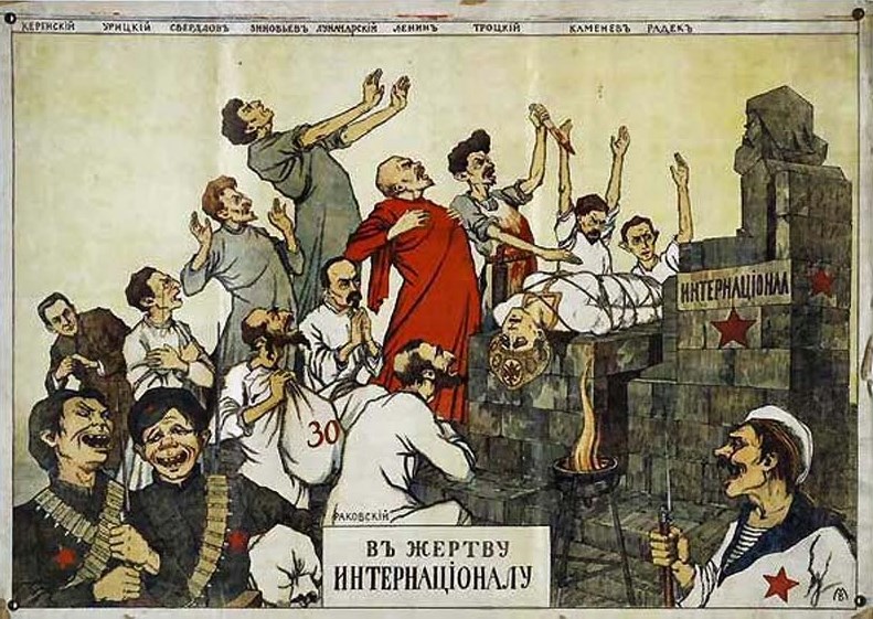 «В жертву Інтернаціоналу». Російський плакат 1918 р. Класичний приклад візуального супроводу міфу про «жидокомуну». На зображенні лідери уряду більшовицької Росії, прізвища яких зазначені вгорі, приносять у жертву Русь (дівчина в національному вбранні). Виразно підкреслена їхня подібність до фігур юдеїв, зокрема Юди Іскаріота, який притискає до грудей мішок із тридцятьма срібняками